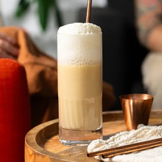 1. Add the following into a shaker and vigorously dry-shake (without ice) for 10 seconds. Add ice and shake again until well-chilled: